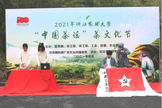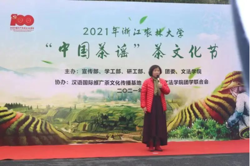 4月8日下午,由汉语国际推广茶文化传播基地协办的2021年浙江农林大学“中国茶谣”茶文化节在东湖校区学十六茶文化学院茗茶园开幕。校党委副书记施美红,党委委员、宣传部部长倪建均,文法学院名誉院长、汉语国际推广茶文化传播基地主任王旭烽出席,主办单位宣传部、学工部、研工部、工会、团委、文法学院相关负责人及师生代表共60余人参与活动。