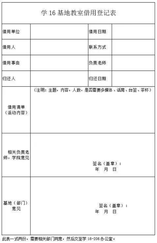 现学十六基地二楼接待厅及教室面向全校开放,需至少提前三天联系牟同学(15984495005)并提交申请表。