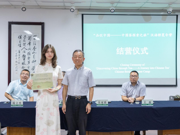 8月5日,汉语国际推广茶文化传播基地为期14天的“品饮中国·中国茶探索之旅”夏令营团以“六茶共舞”茶会的形式完满结束。浙江农林大学副校长吴家胜、浙江农林大学国际教育学院院长赵有华、浙江农林大学茶学与茶文化学院院长王磊、浙江农林大学国际合作交流处副处长陈立杰、塞尔维亚卡尔洛夫茨文法高中本土汉语教师Marijana Marković、汉语国际推广茶文化传播基地副秘书长包小慧及“品饮中国·中国茶探索之旅”夏令营团全体学员参加了本次夏令营团结营仪式。浙江农林大学副校长吴家胜为夏令营团学员一一颁发证书。
