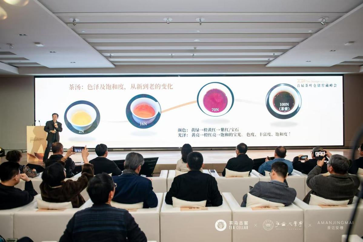 理学博士、研究员、广东省茶叶收藏与鉴赏协会会长、原广东省农科院副院长陈栋说,根据我们20多年研究,老茶是可以喝的,可是并不是所有的老茶都一定适合喝,关键看怎么存放。普洱茶从新茶转变为陈年老茶的过程,茶汤颜色从红黄色到橙黄色再到深红褐色,在仓储过程中,最早去掉的是青草的味道和水味,然后保留花蜜香,再往下走是果蜜香,之后呈现各种各样的药香、木香,是什么推动了这些变化?经过反复研究证实,我们发现从新茶转变为老茶的过程里,首先是叶绿素和酯型儿茶素的降解转化,渐渐的,微生物把新茶中原来不溶解的细胞壁、细胞膜组织降解成多糖、单糖和短肽,结合生成了黄酮(醇)苷和酰基儿茶素类化合物,这个过程最关键的就是仓储、窖藏。坐落在景迈山下的茶马古窖,应用最新科技手段和成果对茶仓的空间材料、气体循环、温湿度控制、商业物流服务等功能进行科学设计,让不标准的普洱茶在这里可以标准化出品,用标准化产出好品质老茶,服务世界。
