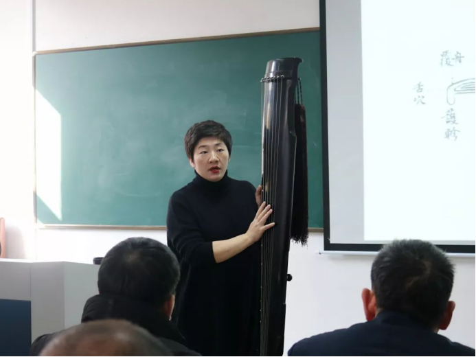 包老师从古琴的起源和发展史入手,生动形象地讲解了古琴构造、 文化精神内涵和古琴基本演奏方法。包老师现场展示古琴并邀请学员一同体验古琴艺术之魅力。包老师强调古琴是一种浑身上下都散发着文化气息的乐器。弹琴者必须尊重和体会琴曲所示之意,要准确地把握琴曲的典故背景和思想内涵。