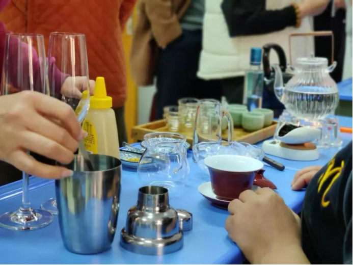 周老师表演完之后,让学员们自行调配茶酒,大家纷纷自己动手调饮,场面热火朝天,十分热闹。