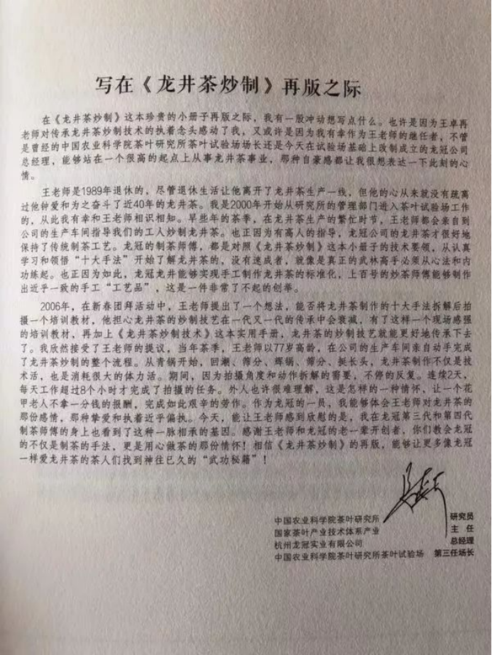 作为国营杭州龙井茶场老场长,老先生制茶、爱茶的一生和一位名叫阿洪的师傅分不开,他曾经跟着阿洪师傅学制茶三年,与阿洪师傅共事近10年,悉数学到了阿洪师傅的一手绝活。并将将这份原本面临失传的工艺传承给了新一代的龙冠人。这是一个典型的中国传统茶文化技能的传承、创新与发展的过程。王老先生退休之后把这工艺手法用文字记录了下来,记忆就此凝固在了这一本名为《龙井茶炒制》的小册子。此书由龙冠公司的总经理姜爱芹女士赠送给了每位学员。