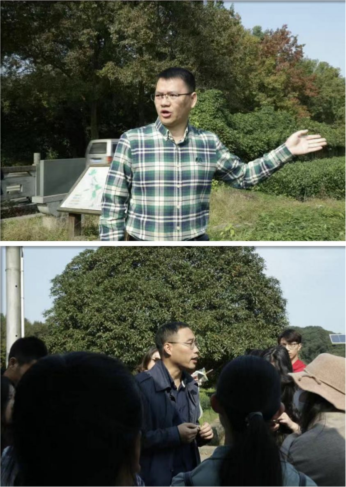 考察从茶园开始。茶叶研究所的副总陈瑞鸿和产品部经理汪旭明专门带领所有学员考察龙井茶园的种植基地。在考察过程中,专业人员对茶叶研究所目前主要生产的龙井茶类、诸多茶类之间的区别、相关种植生产的基础设施、自然环境等均做了介绍,期间学员也就个人对龙井的认识参与交流,并得知:目前中国茶叶研究所主要生产的茶叶包括市场份额占比最高的群体种、研究所自身研发的龙井43以及新研发的中茶108三类,目前以种植龙井43为主,约占60%。