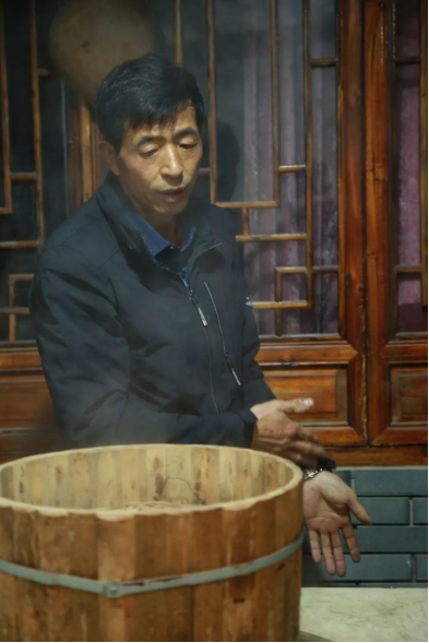 第一步,土灶生火,铁锅里倒入一半清水,再放入竹桶,等待水沸。