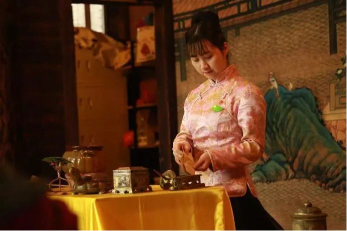于茶艺阁,大家欣赏唐代煮茶法,所用器具参照法门寺出土唐代茶器复原。