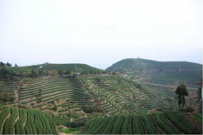 天色渐晚,大家在山顶休憩俯视,晚霞中的万亩茶山高低错落,承载了数十年来几代茶人的期许与汗水。耳畔响起朱朝安先生说起的羊岩精神,羊岩精神亦是茶人精神,时刻提醒我们自强不息、艰苦奋斗 、科学求精、开拓进取。