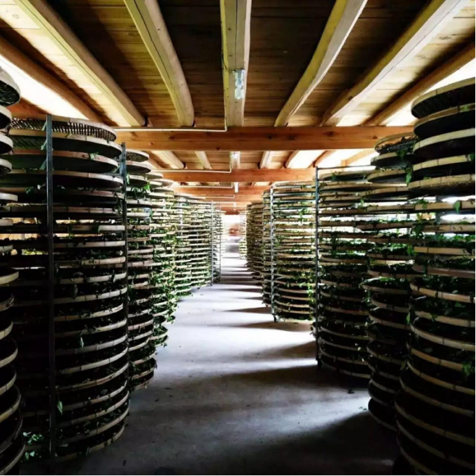 走进生产间,最吸引眼球的是立在房间里如大片竹海般的竹匾,里面盛满了鲜翠欲滴的茶叶。据杨丰老师说,由于他坚持传统手工工艺,这里便拥有一万两千个可以让白茶自然萎凋的竹匾。