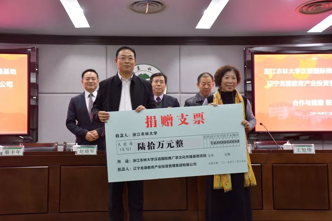 2019年12月19日,浙江农林大学汉语国际推广茶文化传播基地与辽宁龙源教育产业投资管理集团有限公司合作与捐赠签约仪式在东湖校区举行。校长应义斌,龙源集团董事长赵晓军,文法学院名誉院长、汉语国际推广茶文化传播基地主任王旭烽出席仪式。仪式由副校长吴家胜主持。