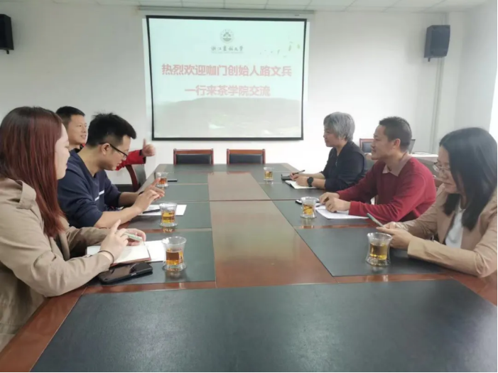11月2日,新茶饮行业新媒体咖门创始人路文兵及其合伙人汤迪、绍兴御茶村茶业有限公司董事长刘志荣一行来茶学与茶文化学院交流。学院党总支书记陈劲松、总支委员苏祝成、茶学专业负责人、党支部书记梁慧玲、妇联主席李春芳及专业相关老师参加了交流。