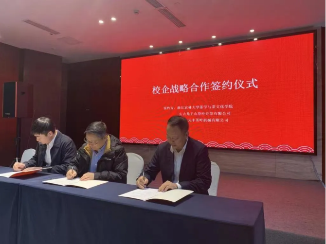 11月17日,浙江农林大学茶学与茶文化学院院长童再康代表学院与安吉龙王山茶叶开发有限公司、安吉元丰茶叶机械有限公司签署了校企战略合作协议。同时,学院与安吉元丰茶叶机械有限公司、上海第二工业大学签署了安吉元丰茶叶机械有限公司装备数字化、智能化研究协议。