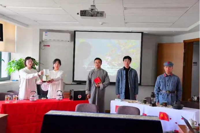之后,王旭烽教授正式开始《中国的茶叙外交》讲座,向参加讲座的各位老师讲述茶与外交的故事。王旭烽教授以国际茶日为切入口,讲述了何为茶叙,随后向在座各位老师同学们讲述了各项茶叙外交,阐述了茶在国际交流中的重要作用。在王旭烽教授讲座休息期间,学生们和基地人员进行了《清贫——可爱的中国》茶艺呈现,得到了在场人员的一致好评。随后王旭烽教授讲座,讲述茶的外交历史,讲解了与不同国家、地区之间的茶事交流的历史与发展;这反映出茶在历史脉络中的重要作用,体现了茶在国事交流、日常生活中的作用。在讲座结束后,王旭烽教授就自己成为作家并与茶相联系起来的经历做了讲解,展现了有情怀、有理想的作家风范。大家在合影留念后,仍进行了一番交流,双方同时期待有更加深入的合作。至此,在中国人民大学的活动圆满结束。