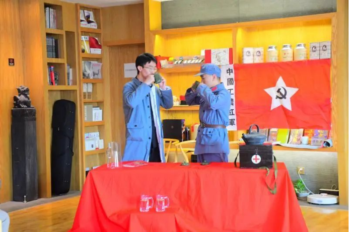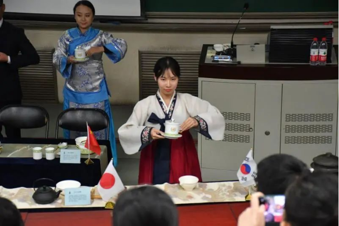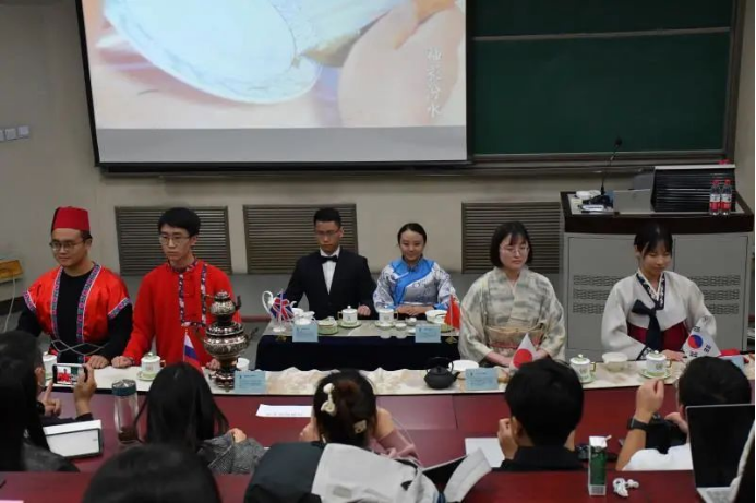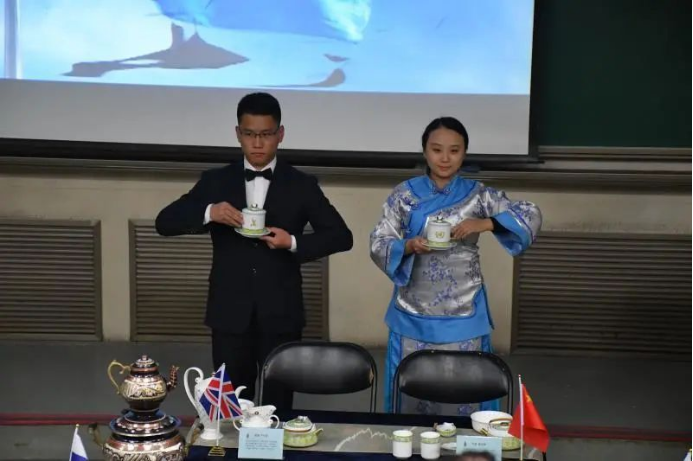 在王旭烽教授上午的讲座结束后,学生们和基地人员进行了《清贫——可爱的中国》茶艺呈现。上午的活动在国际歌的高昂音乐中结束。