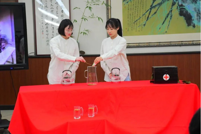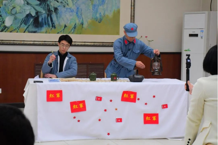 包小慧老师阐述了她对创意茶席的理解与思考后,基地师生原创的茶席艺术呈现——《国际茶日——国际杯》和《清贫——可爱的中国》——逐一亮相。《国际茶日——国际杯》,以“将世界铺成一张茶席,让全人类在此共饮”为创作理念,向国际茶日献礼。《清贫——可爱的中国》,以方志敏烈士与茶的故事为创作源泉,歌颂清贫的高贵品质。这两套茶席艺术呈现得到了活动在场人员的高度好评。