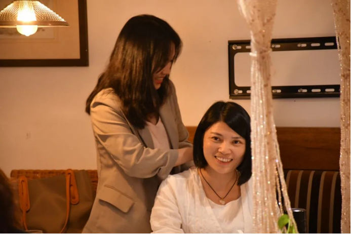 边喝茶边按摩是一种很好的疗愈方法,喝茶让人心静下来,增强精油按摩的效果。可以到达改善焦虑和睡眠,增强免疫力的功效。在按摩中茶精油是必不可少的,唐老师还和学员们分享了如何自制茶精油。