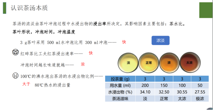 第一部分魏老师先从一杯茶汤讲起,提出茶汤的本质是水浸出物,而水浸出物决定了茶叶的滋味与浓淡,其中茶多酚、可溶性糖等决定了茶汤的滋味,而水浸出物的浸出率则决定茶汤的浓淡。还与同学们一起探讨了,影响茶汤中水浸出物浸出率的影响因素,如茶水比、茶叶形状、冲泡时间、冲泡温度等。
