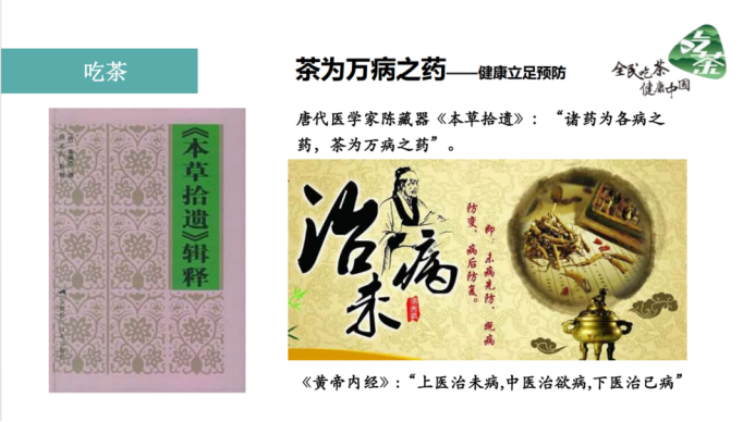 沙建国老师讲道,“有一种叫‘吃茶’的文化,流传千年,形成了今天的茶”,“真正将茶回归本质,是种中药”。经过此次疫情,全民健康上升至国家战略。