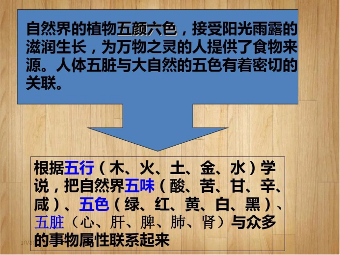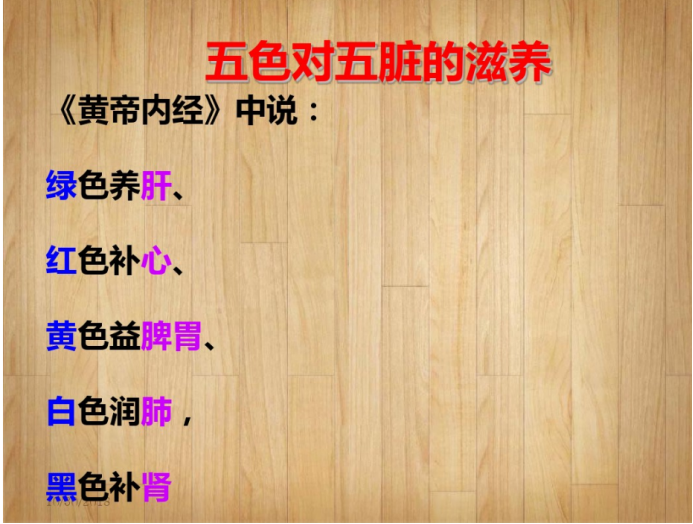 接着,潘老师提到五色五脏理论:青色入肝,赤色入心,黄色入脾,白色入肺,黑色入肾。