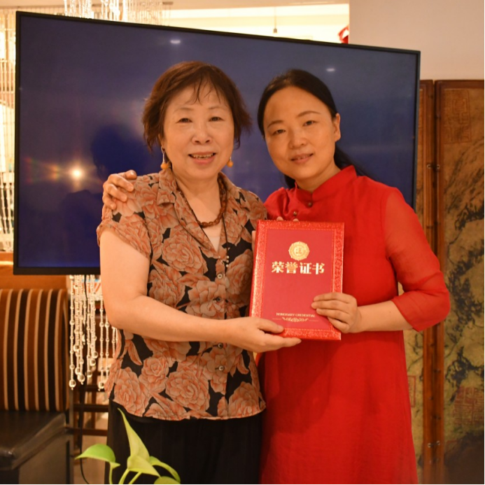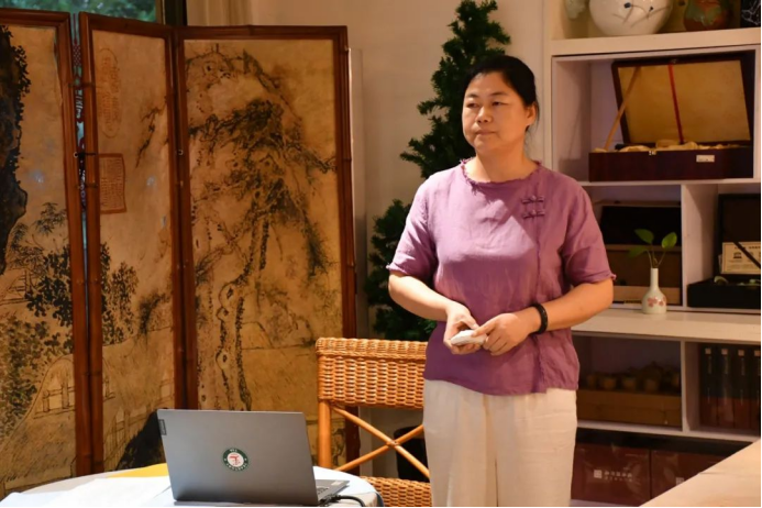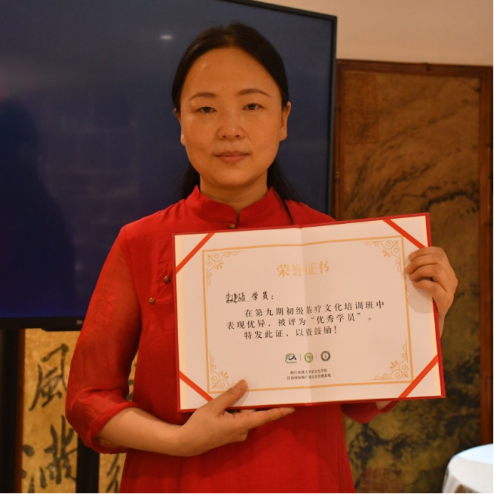 在最后的时间里,王老师对学员们的表现做了总结,并根据其他两位老师的评分,选出朱建丽学员作为本期初级茶疗文化培训“优秀学员”并由王旭烽老师代表基地向朱建丽学员颁发荣誉证书。