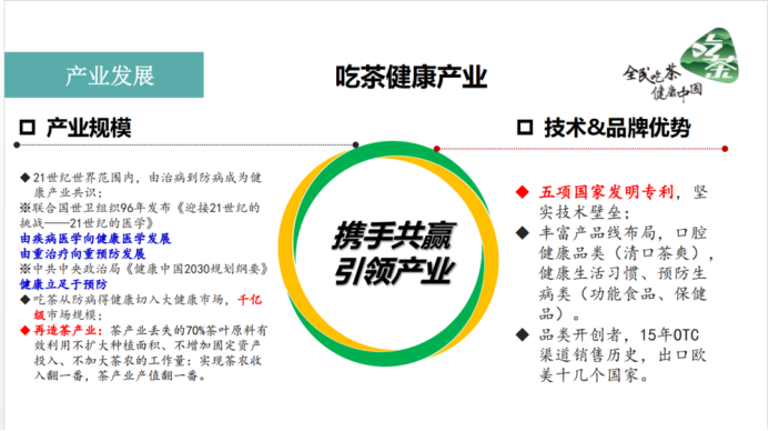《本草拾遗》中载道,“茶为万病之药”,准确来说是茶作为预防万病之药,将在各种污染充斥着人们生活的今天,引领“全民吃茶,健康中国”这一理念成为时代发展人民生活健康的趋势。