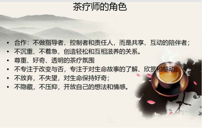 下午的课程,顾老师从“爱”开始,引入茶疗是如何治愈人的,以及作为一个茶疗师,如何委婉、温和地去引导前来咨询的客人发现自我,找到解决自身问题的方法。