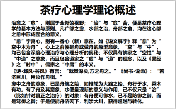 在简短的休息之后,顾老师为学员们讲了茶疗心理学理论概述。以一个小篆体的“思”字为开头,告诉学员们茶疗应该要同时做到“治”和“愈”。“愈”字上半部分像“舟”,是承载人们心灵的“容器”,而在泡茶的过程中,茶器能够作为这个“容器”,来治愈人心。
