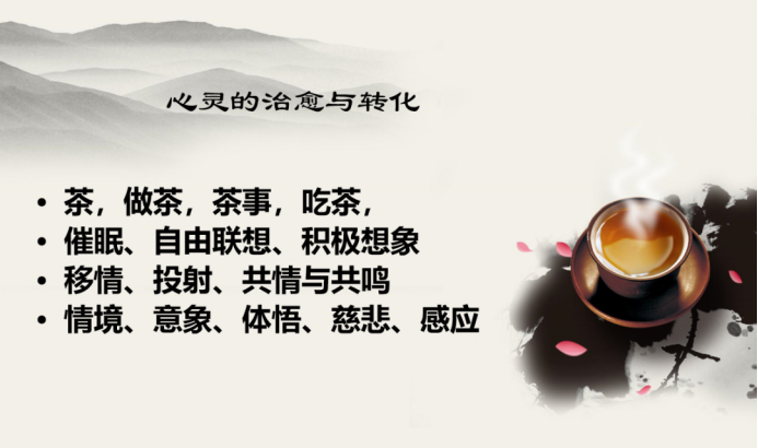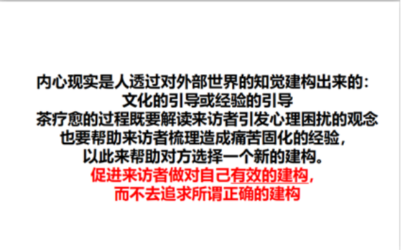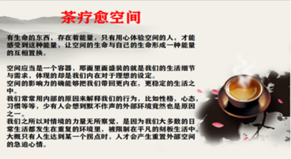 随之,顾老师再慢慢地导入今天的课程。首先,顾老师提及了茶疗愈空间,他认为这个空间要让人一走进去,心就会宁静,感受到安全感。空间内10平方米至15平方米,要保密隔音,方便在里面进行谈话。空间内部应该是温和的:灯光柔和,椅子有把手,有沙发,奢而不华,温度、湿度都让人感到非常的舒适。
