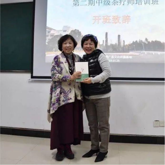 作为茶疗班的惯例,王旭烽老师为首位报名的学员——来自上海的王莺女士赠送签名版的《茶语者》以示欢迎。