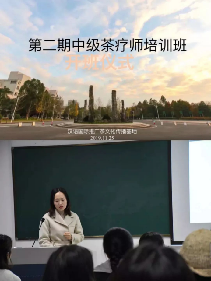 开班仪式由本期茶疗班班主任孙淑莹老师主持,孙老师首先带大家参观了茶文化学院,简单介绍了茶疗班的办学历史和办学目的,带大家观看了《茶,一片叶子的故事》纪录片,然后介绍了负责本次茶疗班的中国茶谣团队。