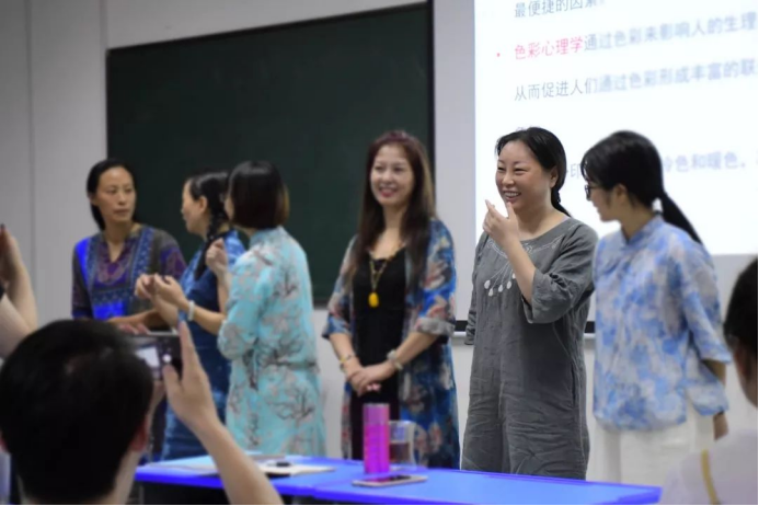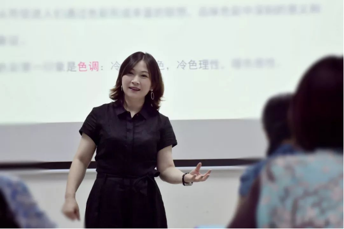 倪老师介绍了色彩分为两个小色调,分别是冷色和暖色。为了让学员们更能区分,老师让同学们根据自己的衣服色调,区分出自己的穿着是属于暖调子还是冷调子。并邀请两个色调的学员们站到讲台,给学员们编号,让台下的学员从暖到冷给学员们的色调程度排序。先让学员们参与其中,发表自己的意见,老师然后通过色相、明度、纯度这三个要素进行分析,通过这么一个环节,学员们对于色调的区分有了明显地了解。