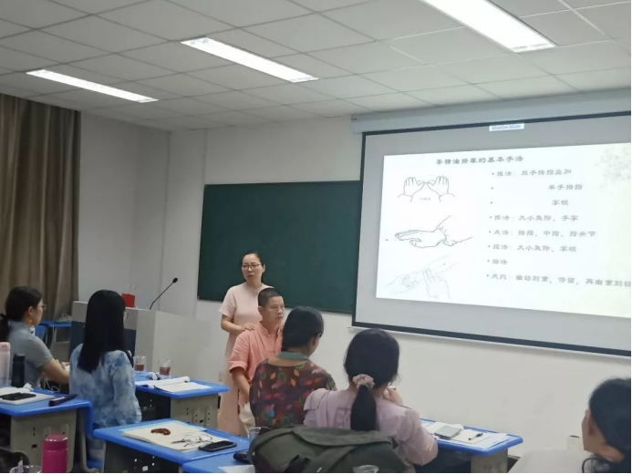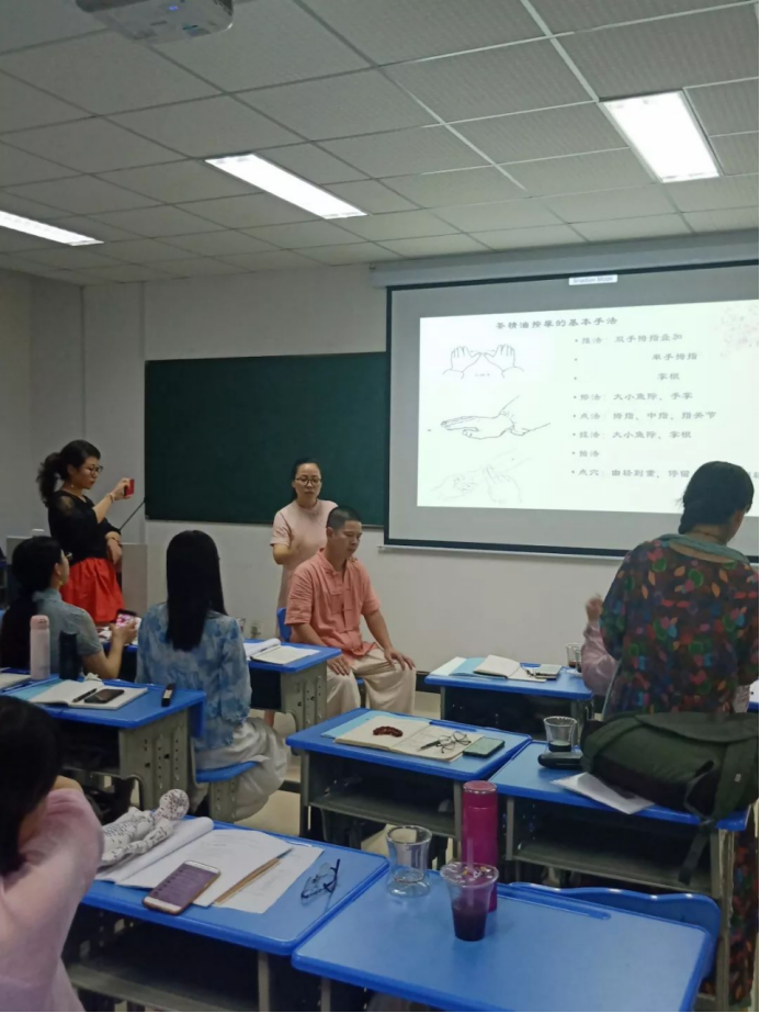 下半节课通过茶精油的体验活动,唐老师亲手示范并讲解了用茶精油按摩的正确手法,并指出茶精油体验活动可以作为茶疗空间的布置内容。通过理论和实践相结合的教学方式,老师和同学们在课堂中一起交流、互动、合作。
