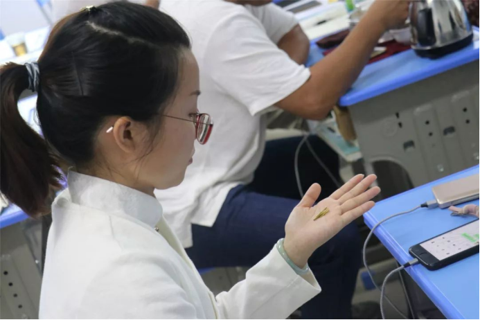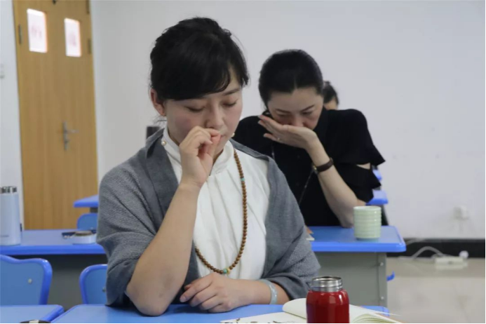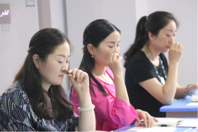 顾老师授课热情四溢,循循善诱,将心理学与茶相结合,强调要用心生活,用心泡茶,用心布置茶席,思与行统一,才能泡出一杯好茶,才能成为一名合格的茶疗师和茶艺师。课上师生互动频繁,学员们还在顾老师的引领下进行由持、香、触、嗅、放、嚼、咽、感七个部分组成的扪心观茶活动,学员们第一次,用舌尖咀嚼茶叶,用心品一杯茶,在放松的状态下用全身心与茶亲密接触。