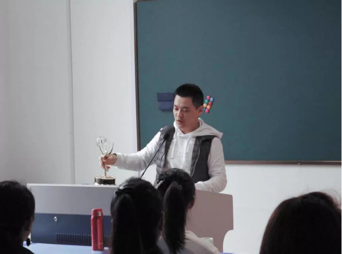 潘城老师手持艾美奖奖杯,向学生们讲述了《中国茶:东方神药》这部由浙江农林大学汉语国际推广茶文化传播基地和美国肯尼索州立大学孔子学院共同制作的中华茶文化纪录片,此部纪录片一举夺得最佳专题纪录片奖、最佳编剧奖、最佳导演奖、最佳摄影奖、最佳后期制作奖、最佳灯光奖等6项大奖。是第69届艾美奖获奖最多的参评作品。