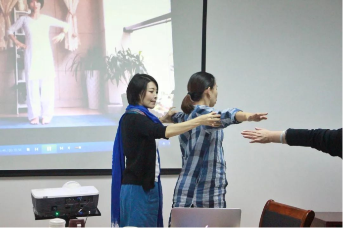 学员们在曹丽丽的引导下现场感受茶香呼吸控制法,将茶与清理经络呼吸控制法、太阳式呼吸控制法、月亮式呼吸控制法相互融合。