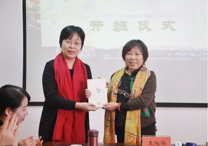 王旭烽教授为首位报名的学员黄少梨赠送签名版《茶语者》以示欢迎。