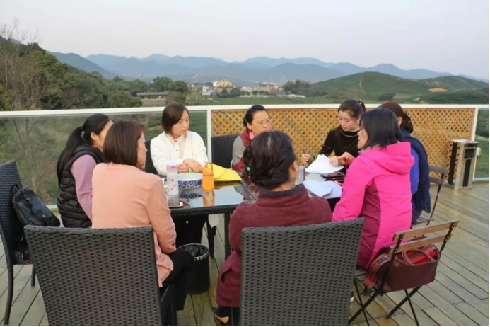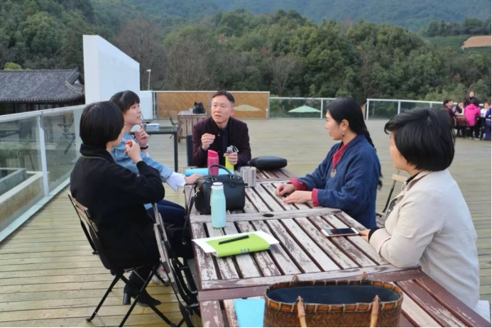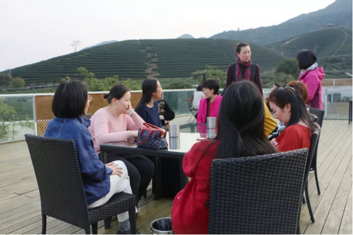 傍晚时分,学员们在视野开阔的天台上自由讨论,呼吸着这般的新鲜空气,思绪如鸟儿般自由翱翔于这绵延的茶山之中。
