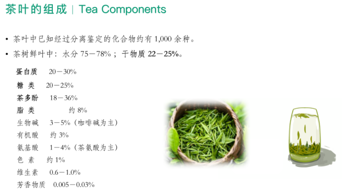课程还详细地讲解了茶叶的生物化学物质组成、功能性成分、特征性成分。特别针对各重要的茶叶生物化学成分对人体的养生保健机理进行了充分的讲解与分享。