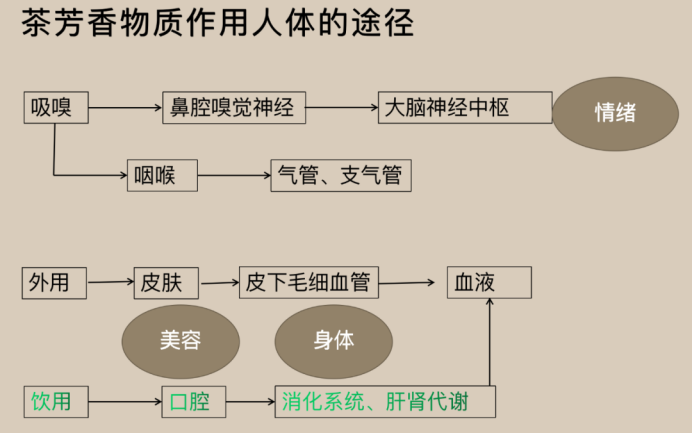 何为茶芳香疗法?“茶芳香疗法是指茶叶中的芳香物质通过吸嗅、泡浴、按摩等嗅觉和触觉的方式作用于人体,对人体身体、情绪、皮肤达到健康保健的作用。茶芳香疗法是茶疗的一部分,其理论基础是中医香薰理论与经络基础理论。其中茶叶挥发性物质是茶芳香疗法的核心物质。” 唐平平老师解释道。
