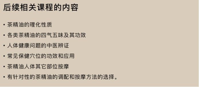 紧接着实用茶精油经络按摩、颈部肌肉放松按摩操和颈部按摩基本原则等精彩实用的内容纷至沓来。这些宝贵的课程内容,非常适宜需要改善焦虑与失眠、增强免疫力、缓解痛经的亚健康人群在日常生活中应用。