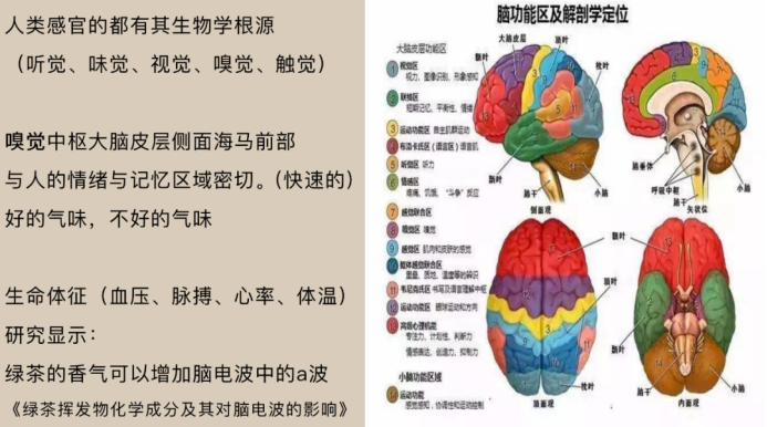 唐平平老师在课程的开始,带大家解析了人体大脑各功能区与人体听觉、味觉、视觉、嗅觉、触觉五大感官的科学关系。特别是针对嗅觉与触觉两个维度,为大家讲解茶叶香气与大脑健康的独特关系。