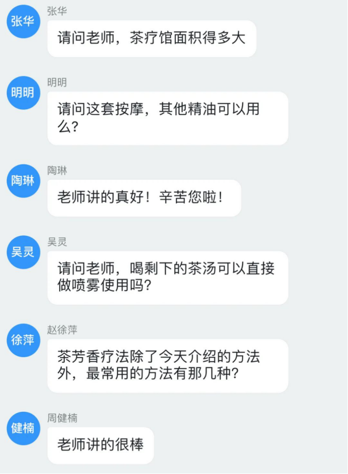 接着,唐老师从嗅觉、热蒸气之散法弥漫、护肤、空气净化和茶精油按摩几个生活板块为大家详细讲解了茶芳香疗法的使用方法,干货满满、令人受益匪浅。除此之外还有以下更多精彩内容:茶精油的萃取方式、茶精油与茶树精油的区别、茶精油浓度计算方法和研究现状。